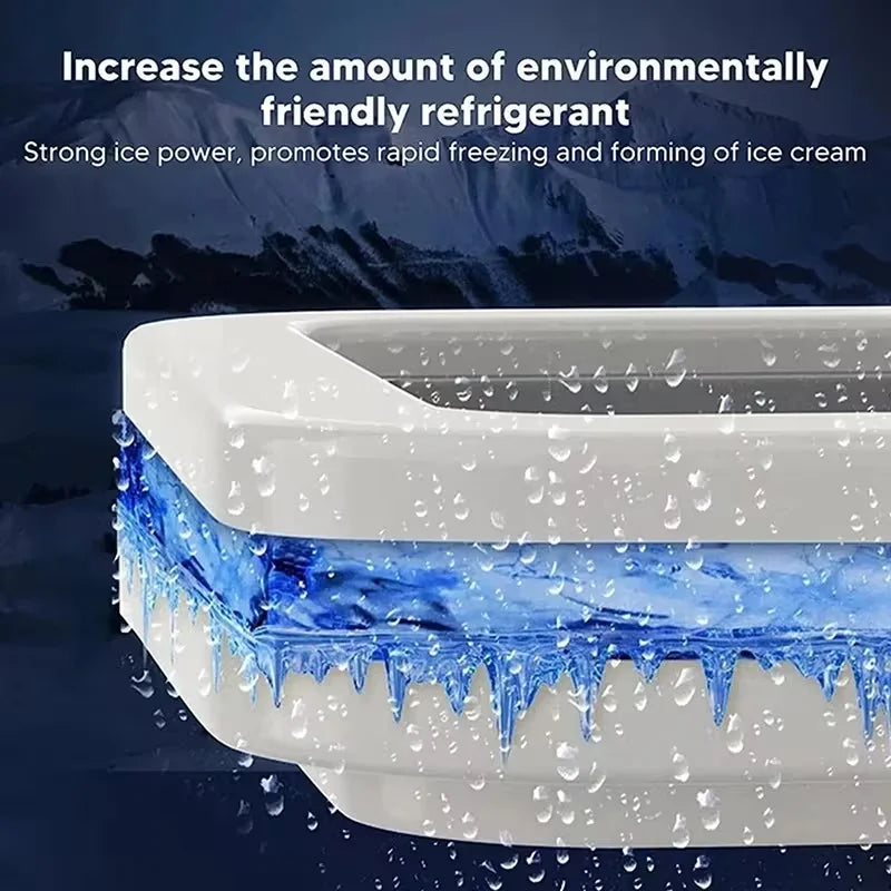 Gießen Sie Ihre Zutaten auf die gekühlte Pfanne, mischen Sie sie und rollen Sie sie zu perfekten Zylindern. Das Ergebnis? Handwerkliches gerolltes Eis wie in Premium-Cafés – von Ihnen selbst gemacht!